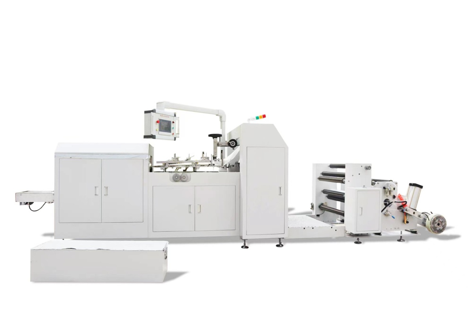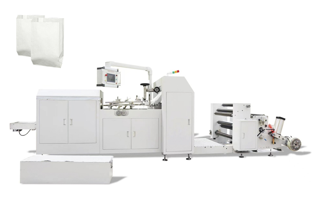 Automatic high-speed paper bag machine by the drum original color paper or printed drum paper such as kraft paper, striped kraft paper, oily paper, food shower film paper, medical paper and other paper roll material bag making process by thorn hole, glue, above, edge formation, interruption, bottom, paste bottom, finished bag output completed.This machine operation is more convenient, more efficient and more stable, is the ideal equipment for the production of various different paper bags, leisure food bags, bread bags, dried fruit bags and other environmentally friendly paper bags.